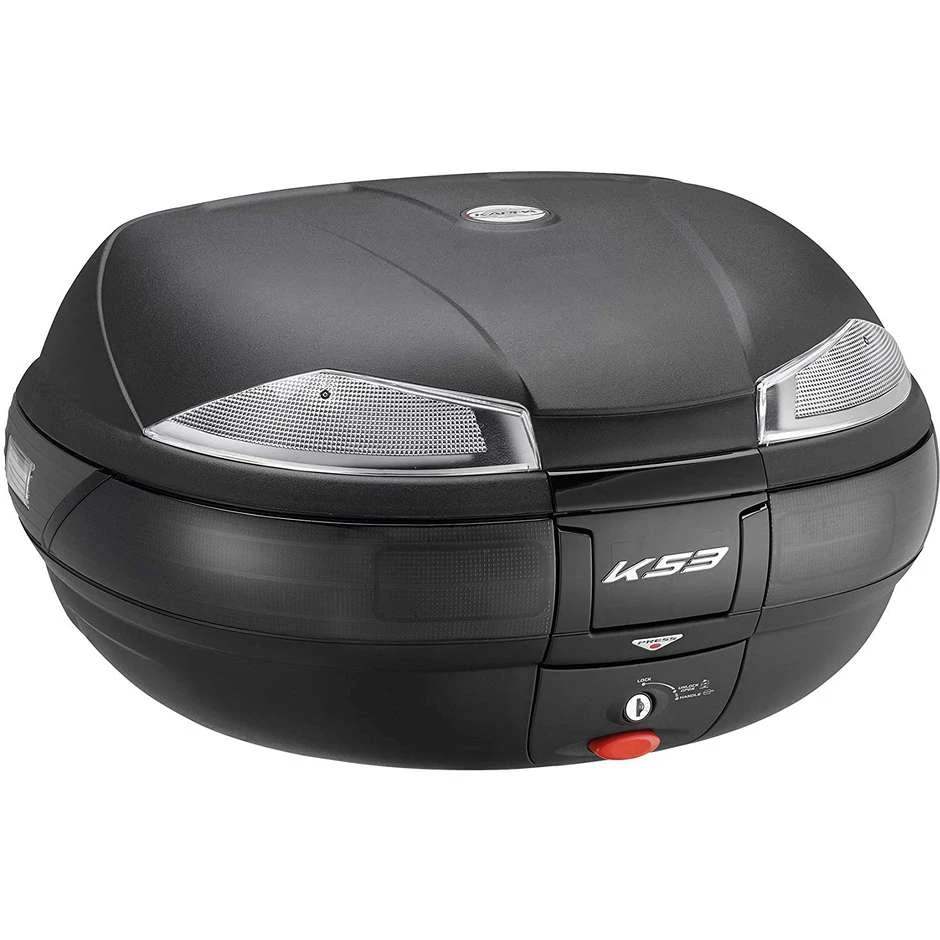 Valigia completa di catadiottro, nera goffrata, capace di accontentare le esigenze di chi ha bisogno di muoversi abitualmente con un bagaglio consistente (la sigla corrisponde alla capacità in litri della valigia). K53 propone una linea aggressiva, in parte dovuta ai due catadiottri laterali.