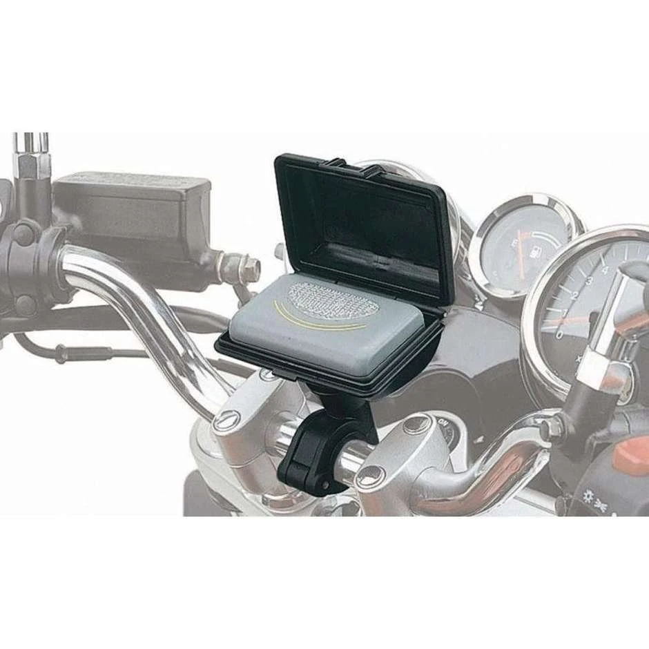 Custodia per dispositivi di pagamento del pedaggio autostradale del tipo “TELEPASS*” con kit universale per il fissaggio su manubri tubolari.