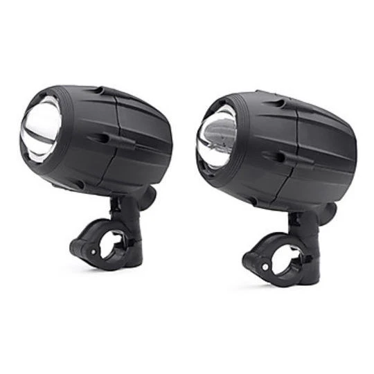 Coppia di proiettori supplementari universali con luci alogene, da montare sui paramotori tubolari (ø minimo 21mm e ø massimo 26mm). Vanno collegati alla batteria della moto, e sono dotati di interruttore da montare sul manubrio tubolare.
